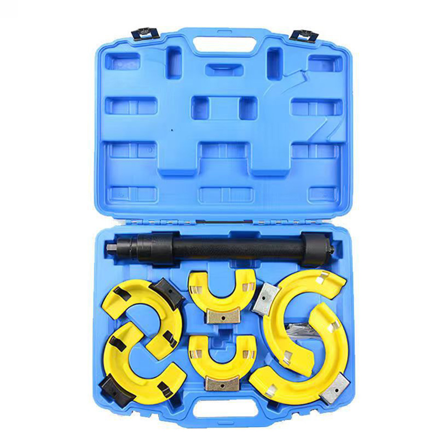 Применяется для снятия и установки пружин амортизационных стоек в подвеске типа МакФерсон (MacPherson)    Комплект набора: Стяжка с рабочим ходом 300 мм и общей длиной 453 мм - 1 шт.  Захваты (полукольца) для снятия пружин, диаметром 80-115 мм - 2 шт.  Захваты (полукольца) для снятия пружин, диаметром 110-150 мм - 2 шт.  Захваты (полукольца) для снятия пружин, диаметром 140-195 мм - 2 шт.  Адаптер для снятия конических пружин - 1 шт.  Кейс для хранения - 1 шт.  Инструкция - 1 шт.    Сжатие пружины происходит за счёт вращения резьбового вала с помощью гаечного ключа или торцевой головки размером 21 мм.