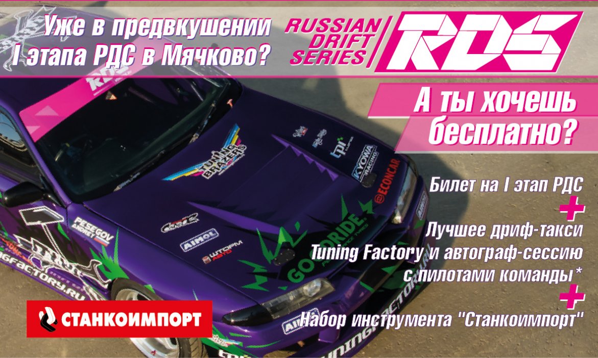 А ты хочешь бесплатный билет на I этап РДС, лучшее дриф-такси Tuning Factory, автограф сессию с пилотами команды и набор инструмента "Станкоимпорт"
